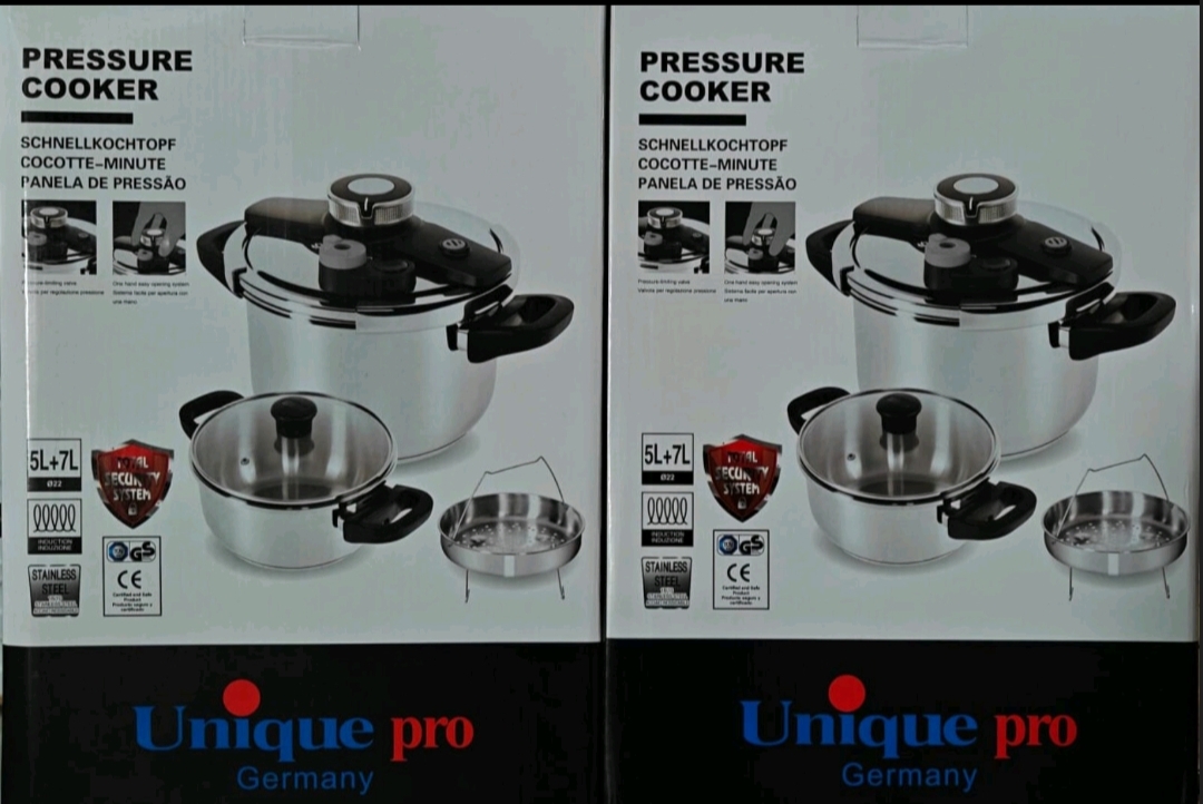 قدر ضغط Unique Pro Germany بسعتي 5L و7L، مصنوع من الستانلس ستيل عالي الجودة مع نظام أمان متكامل وطهي سريع ومتوازن. مثالي لتحضير وجبات لذيذة في وقت أقل وبأقصى أمان. خيار عملي لكل مطبخ
